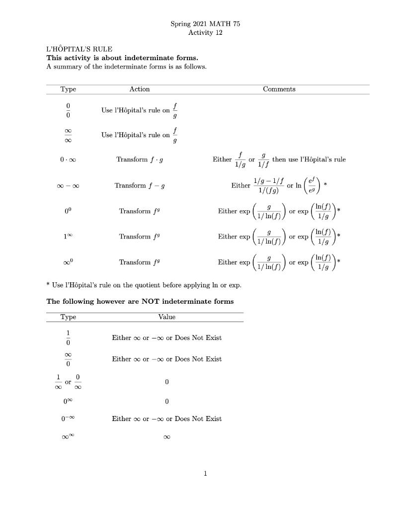 Solved Spring 2021 Math 75 Activity 12 L Hopital S Rule This Chegg Com